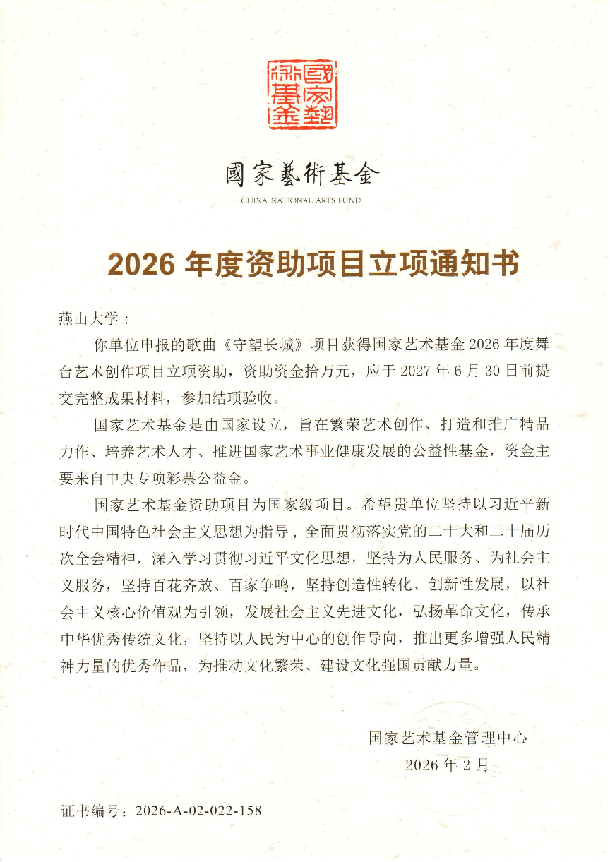 宁岩鹏老师申报的歌曲《守望长城》获批国家艺术基金2026年度舞台艺术创作资助项目。这是亚博体育