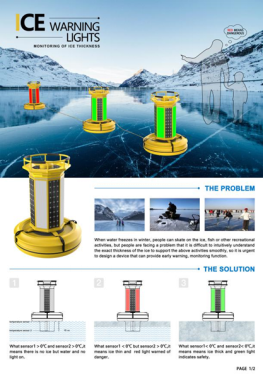 冰面警示灯之所以能获得此项大奖,在于其独具匠心的设计理念、极简实用的设计思想和科技美学创新融合。冬季水面结冰时人们很难直观的判断冰面的厚度是否应达到了足够支撑人们进行滑冰或者冰面钓鱼的厚度,该产品结合温度传感器和太阳能系统,利用温度传感器之间的温度差进行数据对比分析,可以有效的监测冰面是否安全,为冰面钓鱼,冰面滑冰或进行其他活动的人群提供必要的信息。
