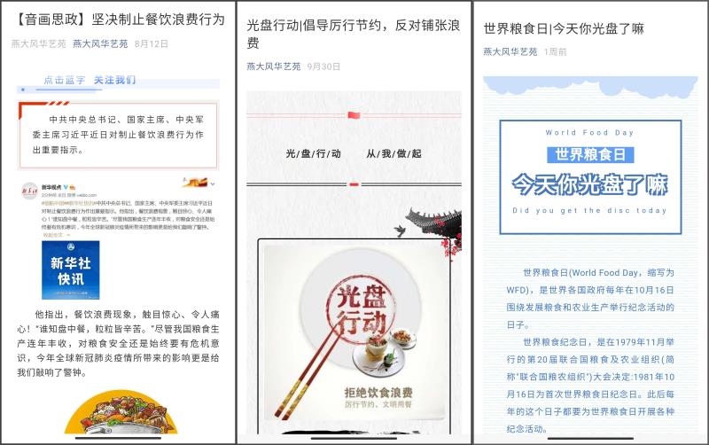持续开展“天地粮心、惜墨如金”系列宣传活动,利用“燕大风华艺苑”网络平台,已发布3期“世界粮食日|今天你光盘了吗”、“光盘行动|倡导厉行节约,反对铺张浪费”、“【音画思政】坚决制止餐饮浪费行为”专题推文,在亚博体育