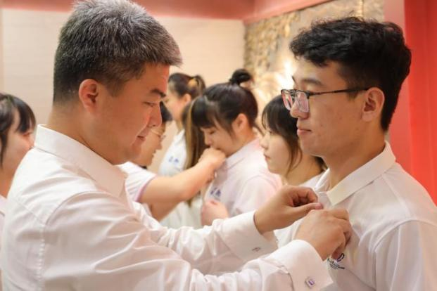 党委副书记宁岩鹏同志、党务中心冯丹红同志和学生党员何妍同志为各支部新党员代表佩戴党员党徽。