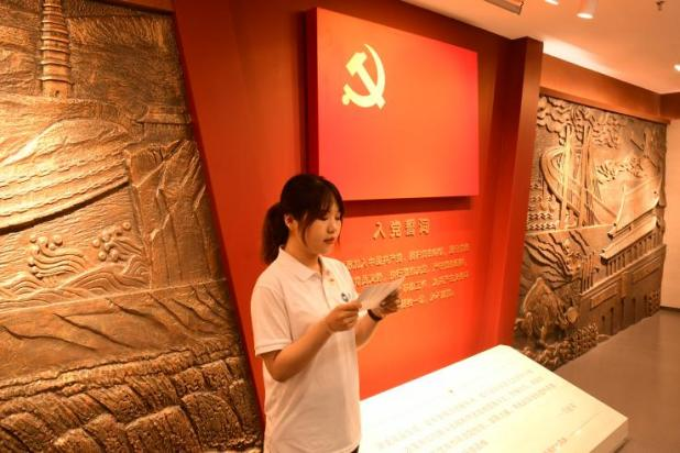 本科生第三党支部新党员、党员组织生活馆讲解员时歌带领新党员们参观亚博体育