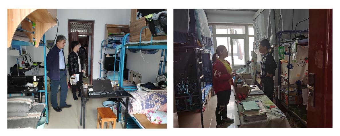走访检查过程中,老师与学生们进行了亲切的交流,听取学生们对宿舍和生活服务设施的意见,询问学习、生活情况,了解学生思想动态,对学生寝室环境卫生、寝室文化建设、寝室学风建设等进行现场指导。