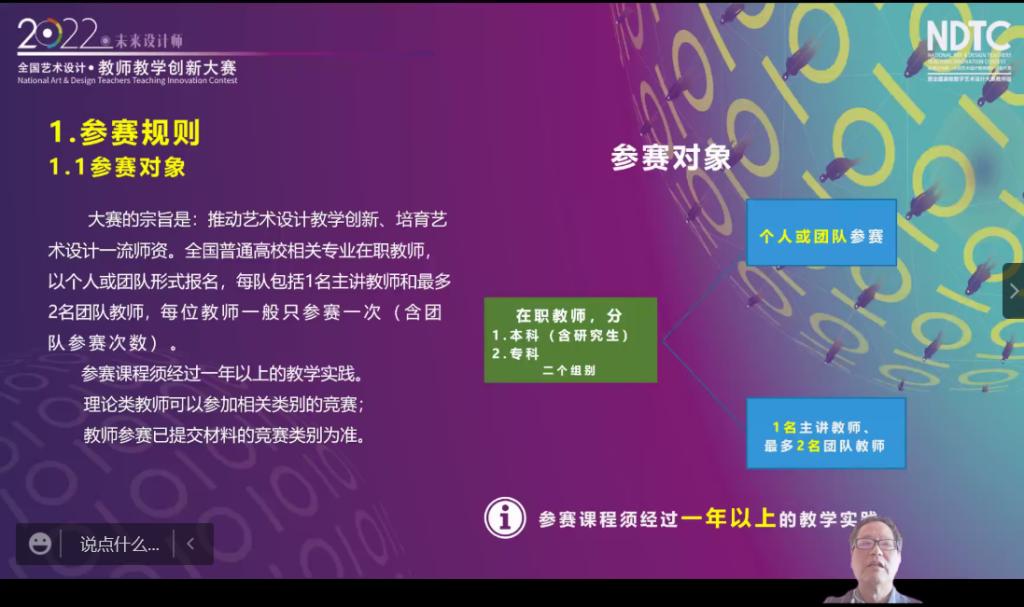 范凯熹教授从四个方面讲解了参赛规则,强调了参赛对象、参赛日程、教学视频、创新报告国赛评审的侧重点,从评审专家的角度对参赛课程的评价方法、评审规则、打分原则等细心解读,并分享了教学新技术应用的实例,将PBL教学模式结合教学成果同步展示,提出了对教学观念与教学方法的深度思考。