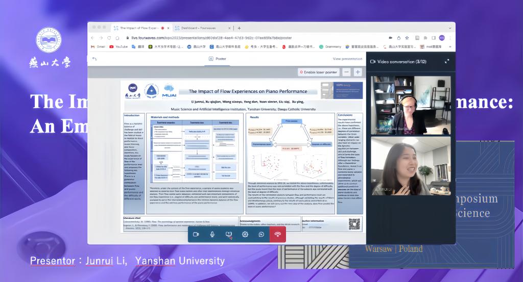 22级音乐与舞蹈学硕士研究生李俊蕊同学(指导教师:许英)进行会议发言,并与Zoé Karlikow(法国索邦大学)、Audrey-Kristel Barbeau(加拿大蒙特利尔魁北克大学)等专家教授围绕通过“心流体验影响钢琴绩效的实证研究”,探索音乐学与心理学、工程学等学科交叉的前沿问题,扎实推进音乐与科学的融合机制研究进行深入交流。