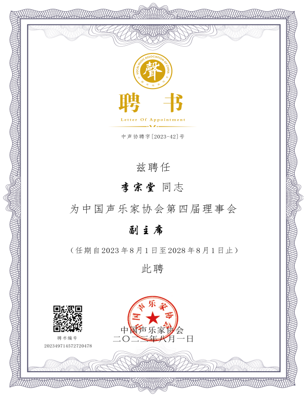 成功召开,大会选举产生了新一届理事会及主席团,李宗堂教授当选中国声乐家协会第四届理事会副主席。