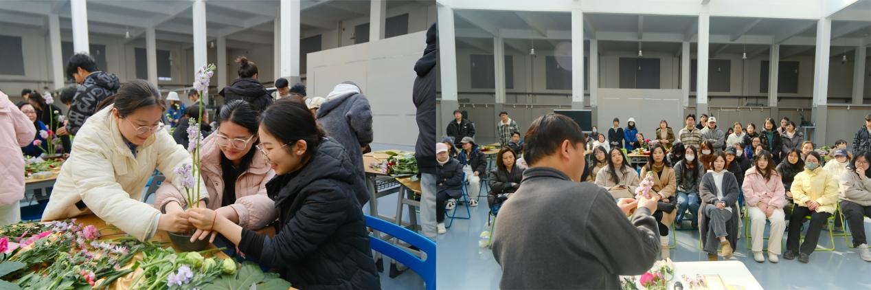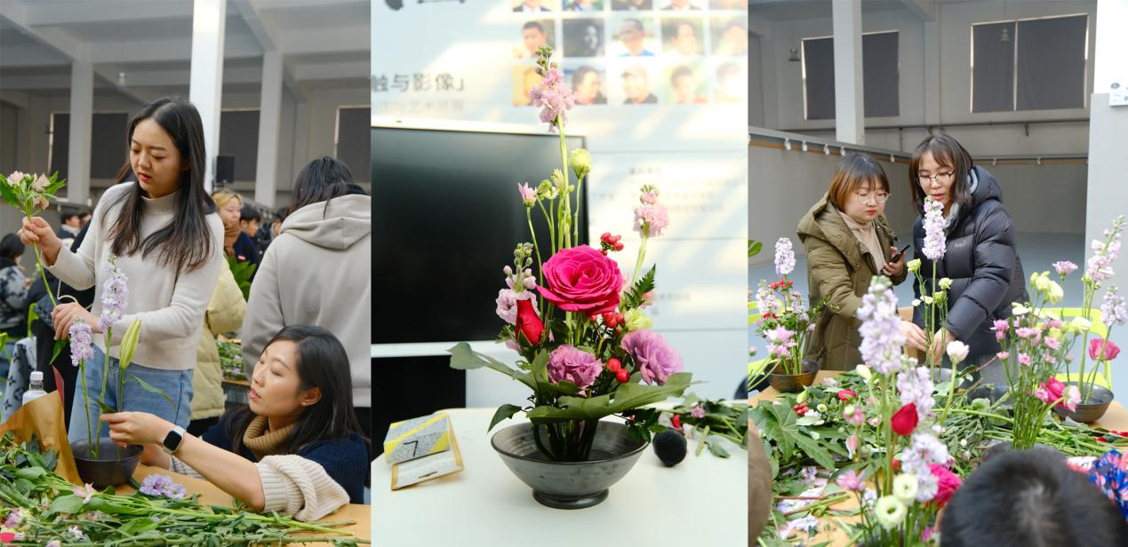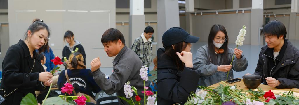 活动伊始,郑志勇教授从中国传统插花艺术精髓讲起,介绍了传统插花的基本知识和常用手法,并以实操演示的方式为同学们展示了插花造型、修建与整枝等技巧与方法,并指导同学们如何选择和组合花材。同学们认真聆听了中国传统插花知识后,在郑志勇教授的指导下,开始整理花材,设计自己的插花作品。在体验插花艺术的过程中,同学们感受到了插花艺术的独特魅力,体悟了中国传统插花的意境,感受到劳动创造与艺术之美的融合,收获知识的同时,陶冶了情操,放松了心情。