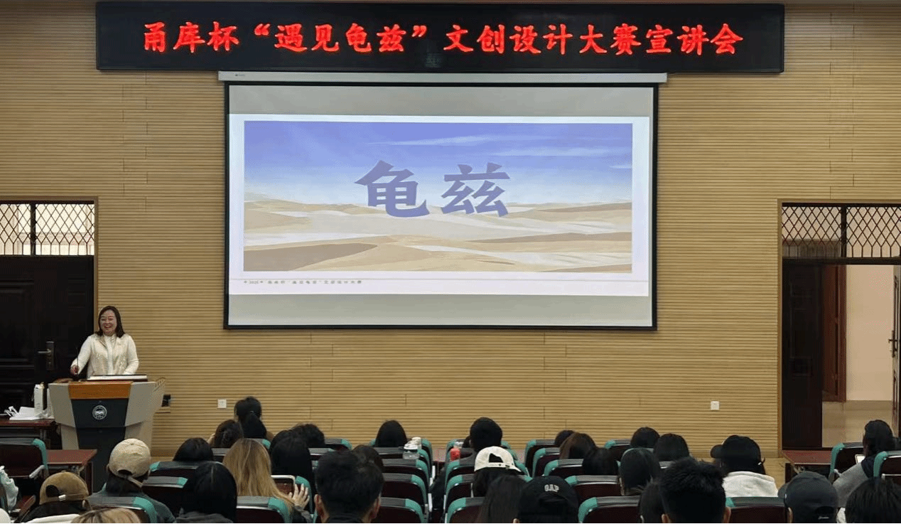 宣讲会上,康金超为同学们详细介绍了龟兹文化元素与甬库杯“遇见龟兹”文创设计大赛的相关情况。大赛旨在通过丰富的创意设计,推动龟兹文化创造性转化、创新性发展,助力文化援疆、产业援疆。大赛设置了“龟兹丝韵”“民族交融”“数绘未来”三大赛道,目前,大赛官网已开通线上报名和作品提交通道,报名参赛的个人或团体可通过数字化素材库获取创作资源。