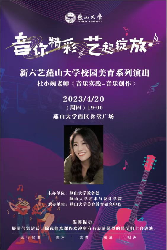 将举办“艺路同行”杜小婉老师课程《音乐实践-音乐创作》结课展演。