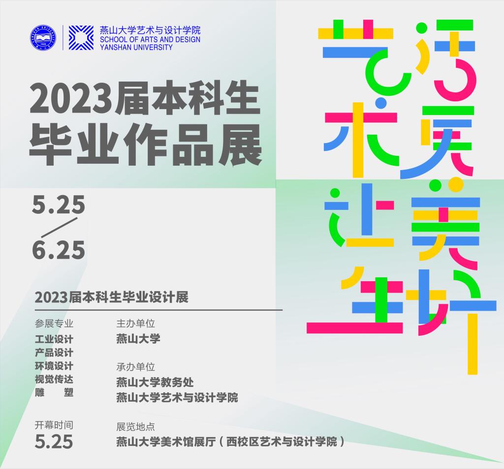 亚博体育 将于2023年5月25日11:20举办“艺术让生活更美好”—2023届本科生毕业作品展开幕式。展览涵盖工业设计、产品设计、环境设计、视觉传达、雕塑五个专业(领域)本科生的毕业设计作品,凝聚了毕业生四年的创新成果和学习结晶,欢迎广大师生前来观展!