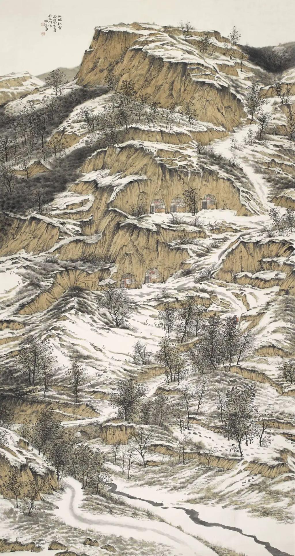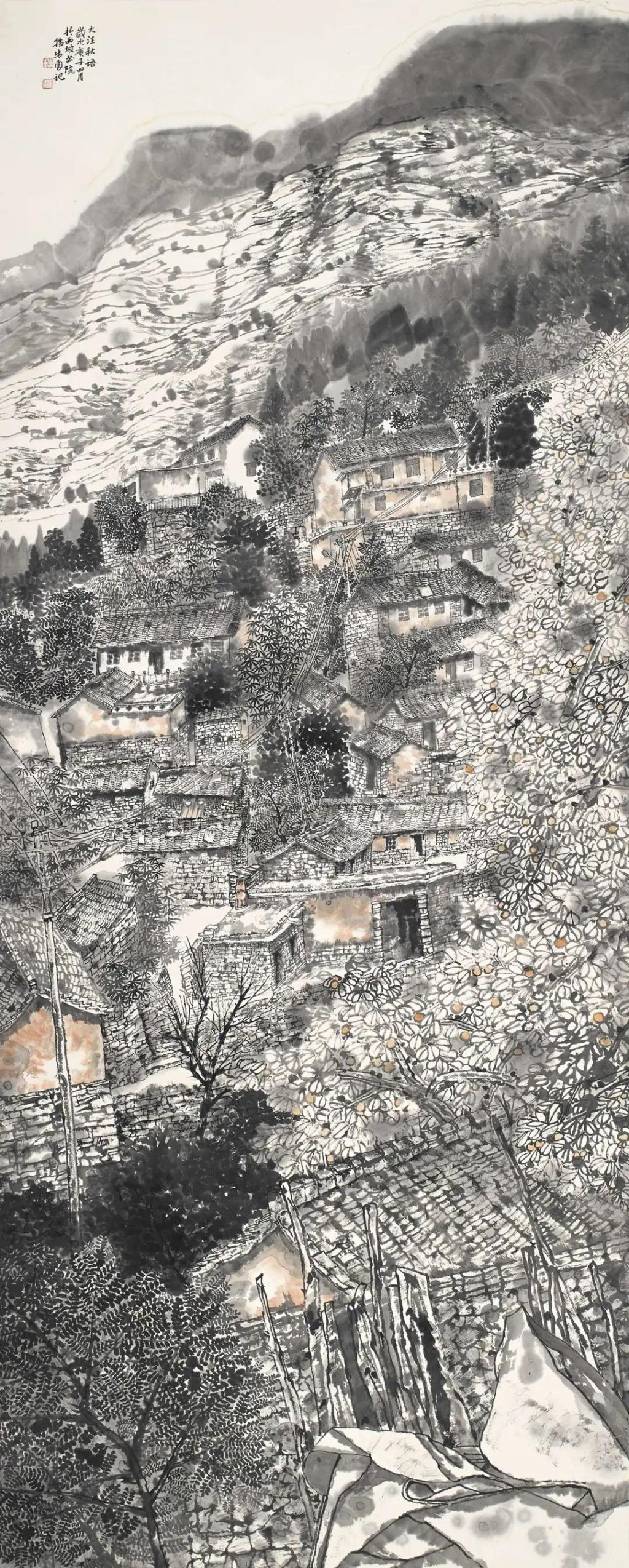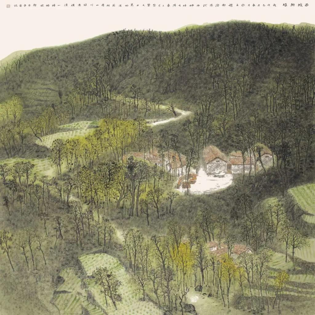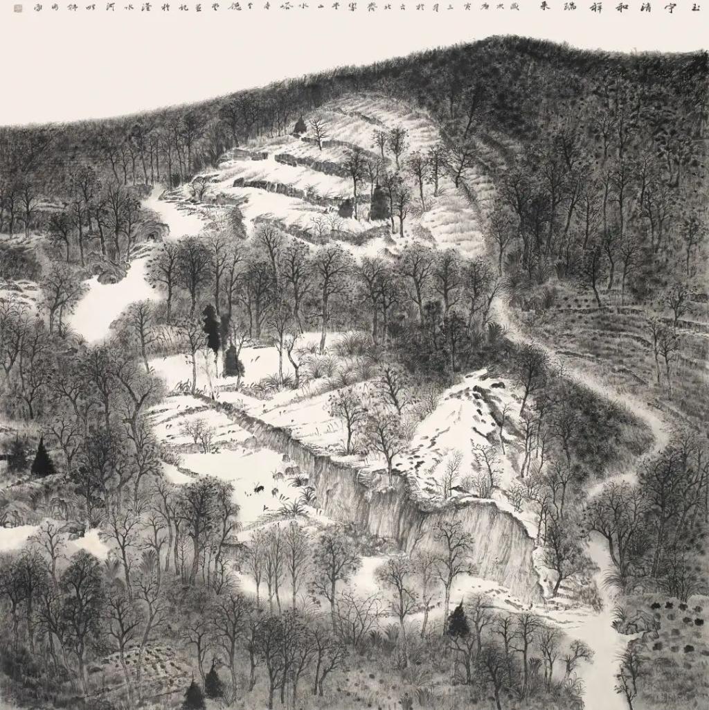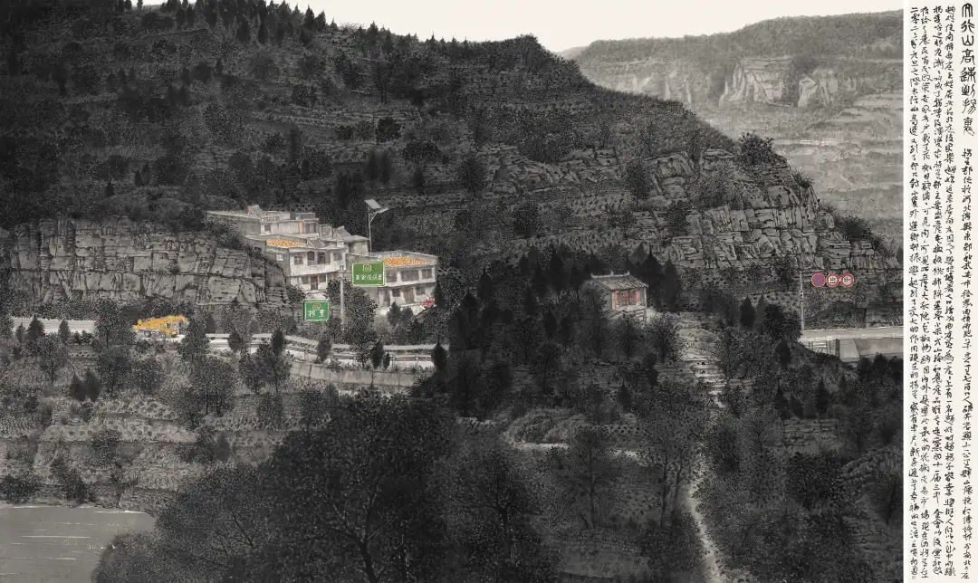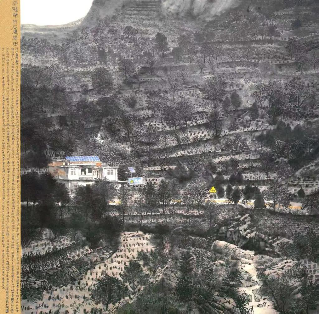 太行山对于韩步勇来说无疑是生命和艺术活具有重要意义的地方。作为在太行山怀抱中成长的画家,以太行山作为他的作品叙事内容,体现了他把绘画创作与自己的生活经验互为映照的创作理念,从而使作品呈现出自身生命信息的承载。他的作品以令人震撼的尺幅把太行山宏伟壮阔厚重雄浑的气象用一种纪念碑式的结构呈现出来,几何状的山体形块处理加强了视觉整体感,并由此来实现从写景到畅神的升华。另一方面,他在细部的刻画中却不厌其烦地把一草一木,一沟一畦,一房一舍这些充满生活气息和自然生机的景物进行具体而详实的表现,在细微之处呈现出太行山的亲切和生动的情境。在他的作品中,太行山既有一种令人高山仰止神魄,又有一种使人亲近的灵性。我想,这大概也是韩步勇在他的作品中希望传达给大家的感受吧。
