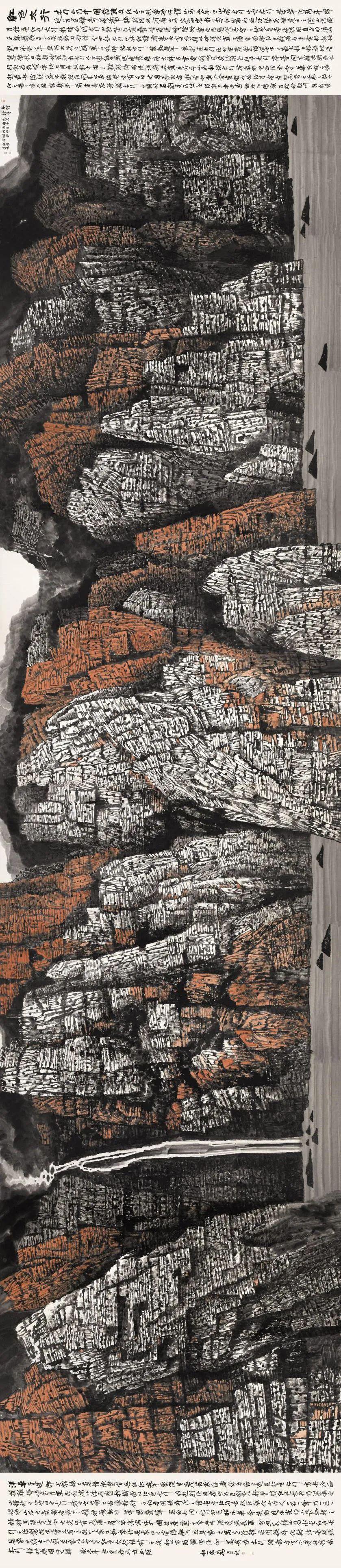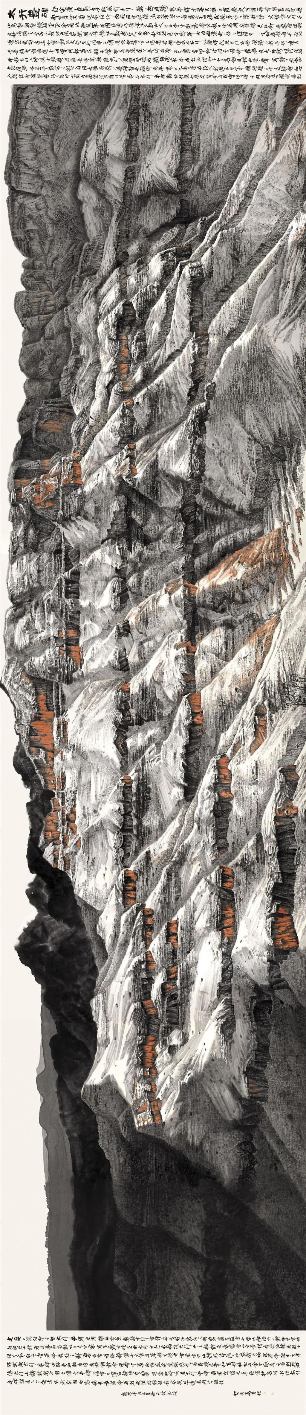 从这批以“红色太行”为主题的鸿篇巨制中,充分彰显了步勇在艺术实践和艺术探索当中的不怕牺牲、艰苦奋斗、不屈不挠的太行精神。习近平总书记《在文化传承发展座谈会上的讲话》中指出:“新时代的文化工作者必须以守正创新的正气和锐气,赓续历史文脉、谱写当代华章。”步勇用手中的画笔默默地绘制太行画像、讲述太行故事、弘扬太行精神的“当代华章”。他汲古斟今,精于运遣,以山水意象去完成内心世界关于时代的描绘。他在长期观察、写生太行山水物象的基础上,造型以写神,形神兼备;立象以尽意,意到笔随。因此,他的太行山水做到了守正创新、别有意蕴:赋笔墨以新意,寄山水以深情,也体现了每件作品有道德、有筋骨、有温度的审美向度。笔下山河美,墨染时代新。步勇通过“红色太行”艺术之美,让世人感受中华文化,留存时代美好,弘扬时代精神。这不仅是时代的使命,也是一个艺术家文化自觉和文化自信、自强的需要。