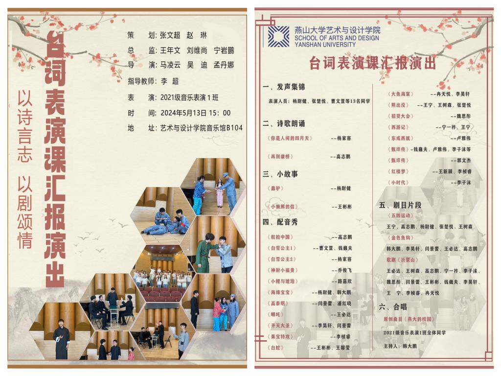 为推进课程思政建设,传承优秀传统文化,推动音乐专业学科发展,以美润心,助力校园文化建设,亚博体育 音乐系将于2024年5月13日举办“以诗言志、以剧颂情”《台词表演课》结课汇报演出。