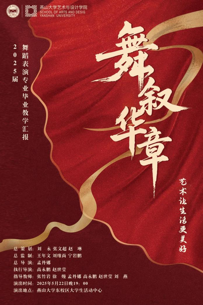 2025届舞蹈表演专业毕业教学汇报将通过“锦绣山河·舞绘丹青”“薪火相传·舞述春秋”“华章永续·舞向未来”三个篇章的作品呈现,以动情的舞蹈语汇展现中华优秀传统文化之美,将燕大青年学子“奋斗基因、工匠精神、卓越品质、家国情怀”的精神于舞台绽放。以舞为桥,传播中华优秀传统文化。