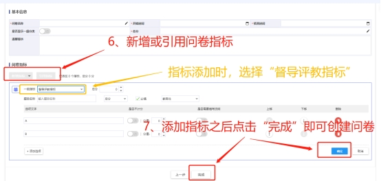 注意事项:1、“基础设置”菜单为“指标库”,可以查看和新增指标,新增的指标可以用在创建“随堂评教”问卷中(或直接创建“随堂评教”问卷,在问卷中直接新增指标也可)